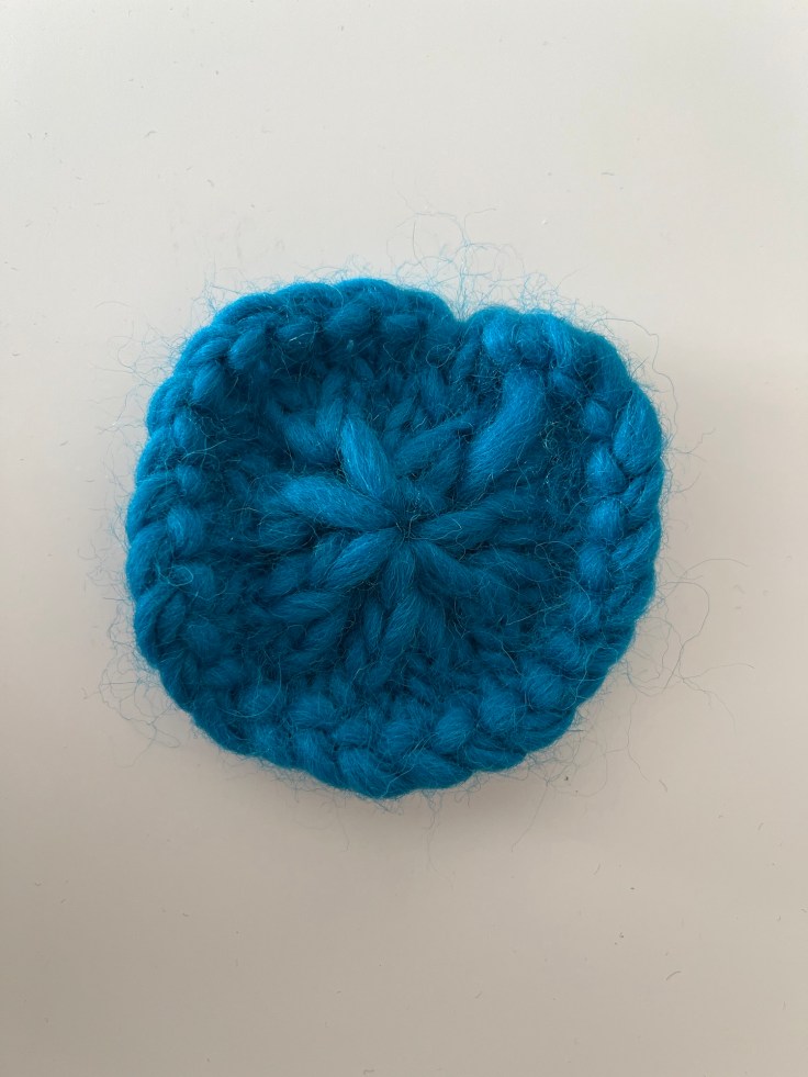 - Round 5 -Break yarn leaving a small tail and thread a tapestry needle with the remaining tail and thread that through the stitches remaining on your knitting needle. Pull the tail tight closing the hole in the centre of the work and thread the tail through to the back of the work.