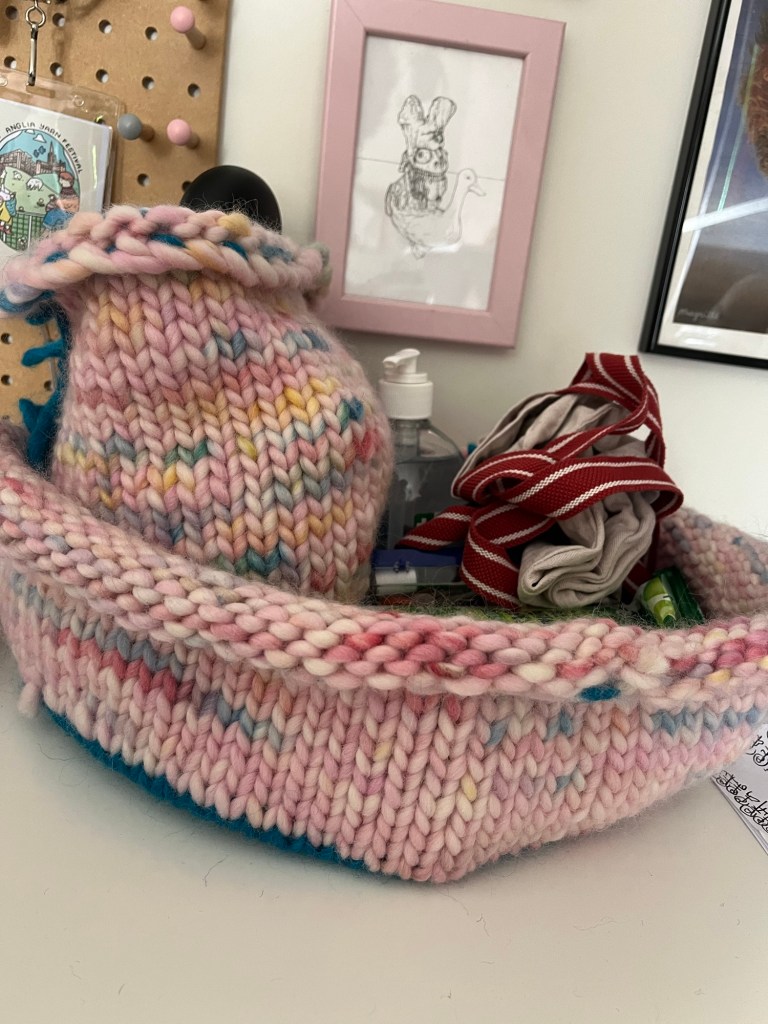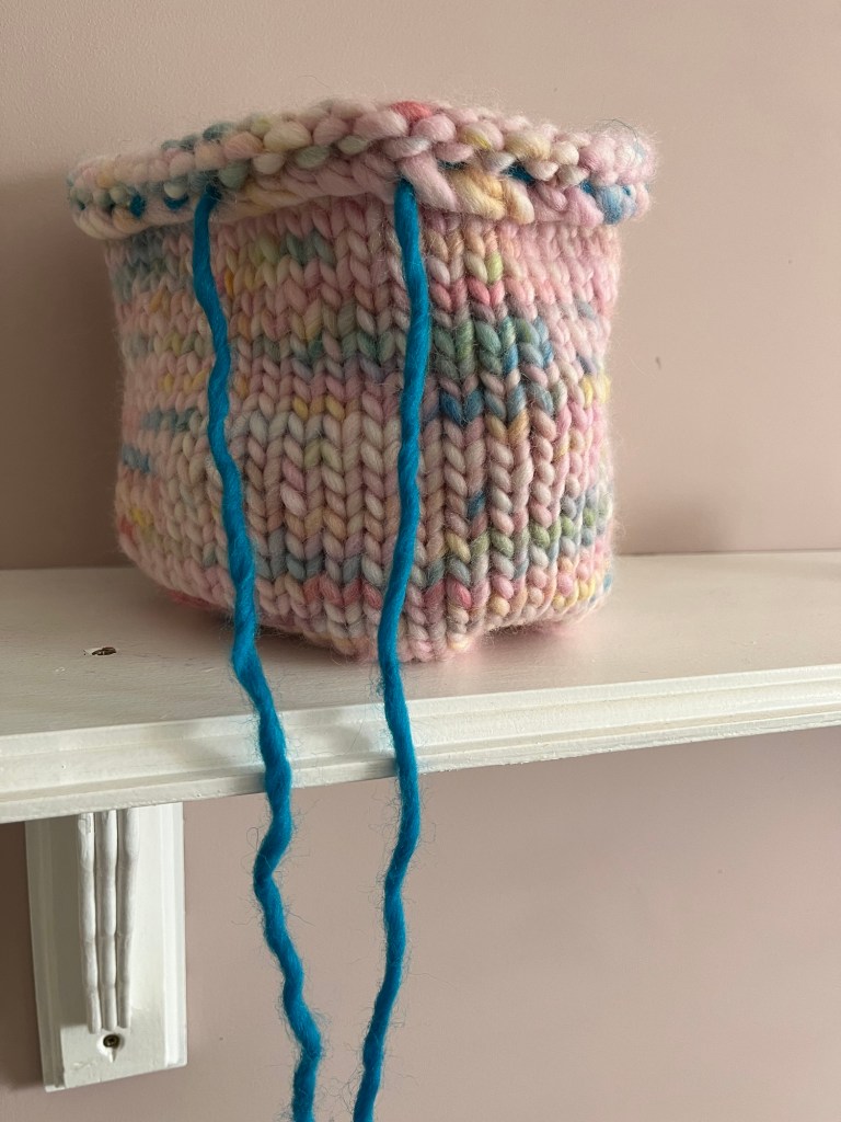 - If you want straps or a draw string, weave some thick yarn (not unspun or roving) through the cast on edge at the top of the basket.