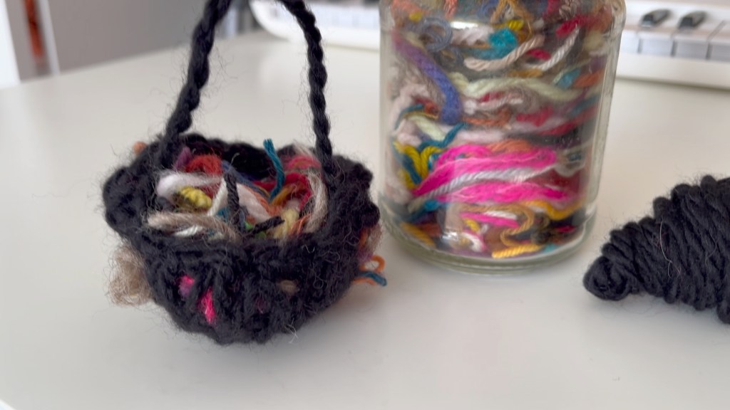 Birds usually use sticks and leaves to build their nests but since I already had a bird helping themselves to my wool, I decided to help them out and create a tiny basket filled with tiny scraps of yarn left over from past projects.